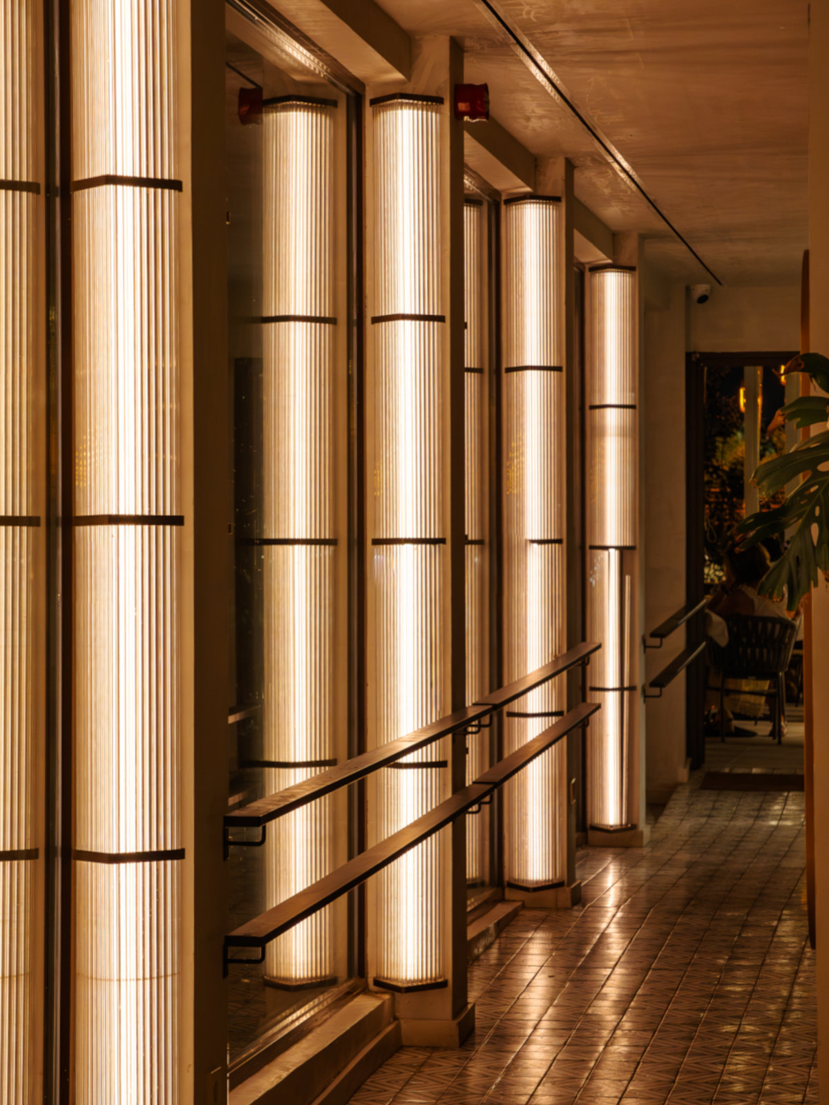 A vertical sequence of light that transforms movement into experience. The Lineal wall lamp redefines the wall as an active, vibrant surface where light filters through glass rods and multiplies into warm reflections. The aged brass structure frames each module like a piece of architectural jewelry, adding texture, depth, and a serene presence that naturally accompanies the passage of space. Its amber color temperature and dimming capability allow for precise control of intensity, creating an enveloping and sophisticated atmosphere.