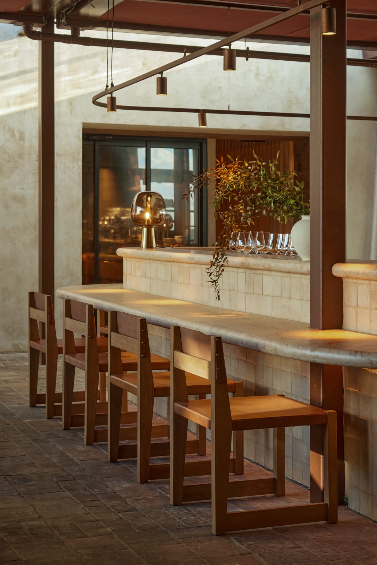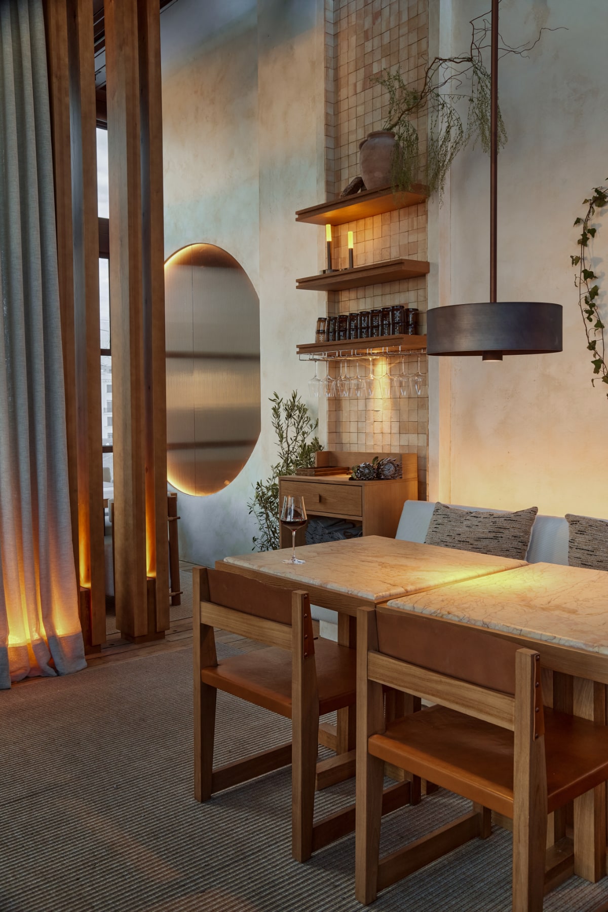 La energía vibrante y acelerada de Madrid pedía a gritos un restaurante como Makáá. Ubicado en la espectacular azotea del Hotel Thompson, en la emblemática Plaza del Carmen, este refugio en las alturas invita a otear los tejados y el pulso de la ciudad mientras el tiempo se detiene en un oasis de calma. Bajo la premisa de la diseñadora Patricia Bustos, el fuego y las brasas se convierten en el eje central del proyecto para generar una calidez humana profunda a través de la luz.