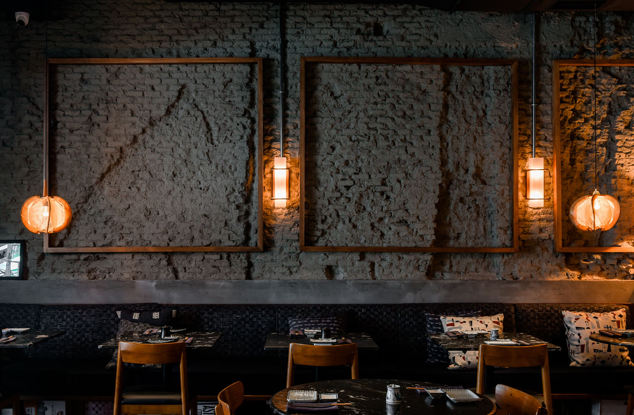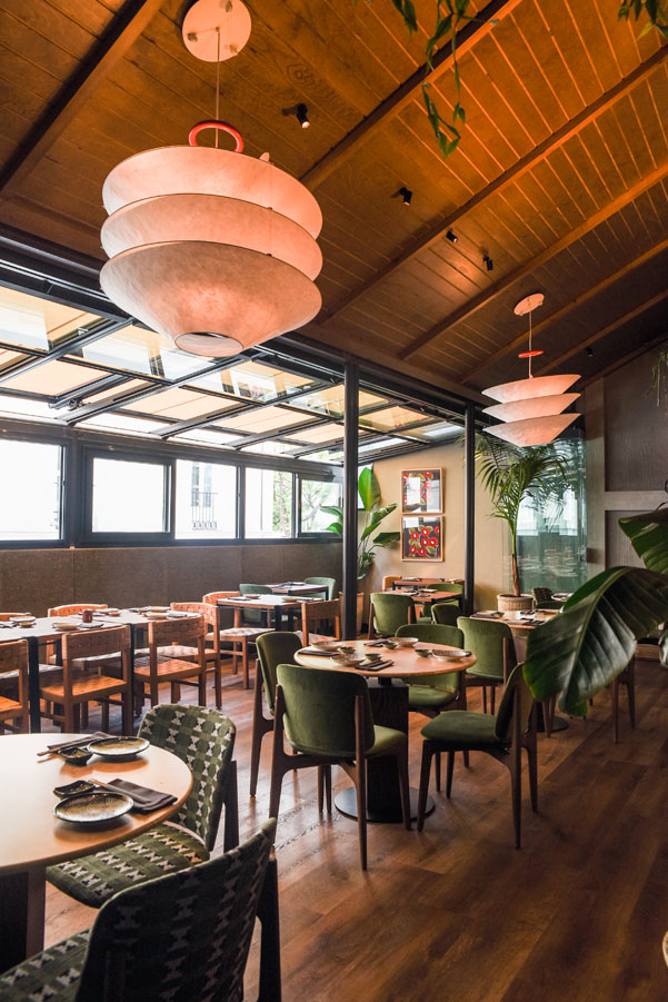 Nos adentramos en el local atravesando un terraza que cobra su esencia más intima en la noche puntualizando con luz tenue y cálida las mesas de los comensales, y creando un juego de sombras con la vegetación del espacio.