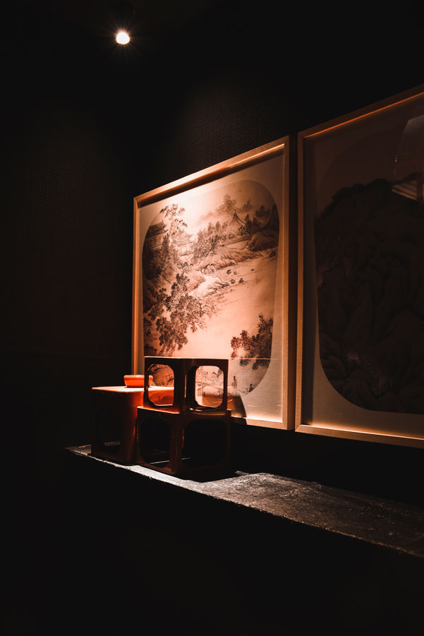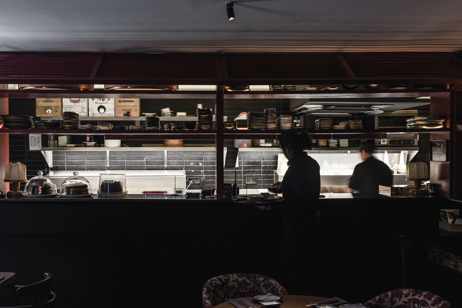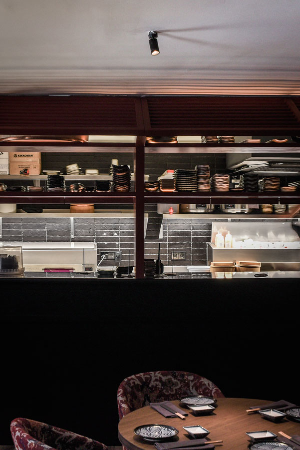 En la primera planta nos encontramos una cocina vista filtrada por una estantería roja retroiluminada, con piezas de menaje japonés, un claro guiño a la Robata japonesa, en la que podemos entrever el carbón vivo y como los cocineros trabajan con él en la preparación de nuestros alimentos. dentro de la parrilla la iluminación es mas técnica, acompañando el trabajo que se desarrolla en este espacio.